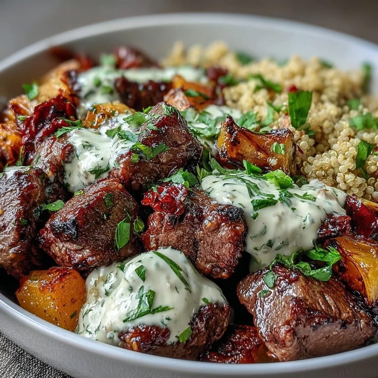 - Start with a bed of fluffy quinoa, arrange the roasted squash and seared steak on top, then drizzle generously with that luscious garlic herb sauce. Sprinkle with extra fresh parsley and serve while everything is still warm.