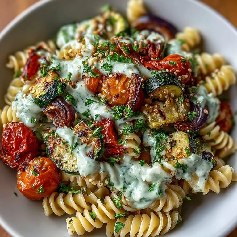 - Pour the cooked pasta and roasted vegetables into your large mixing bowl, then drizzle the tahini sauce over everything and toss gently but thoroughly so every strand of pasta gets coated.
