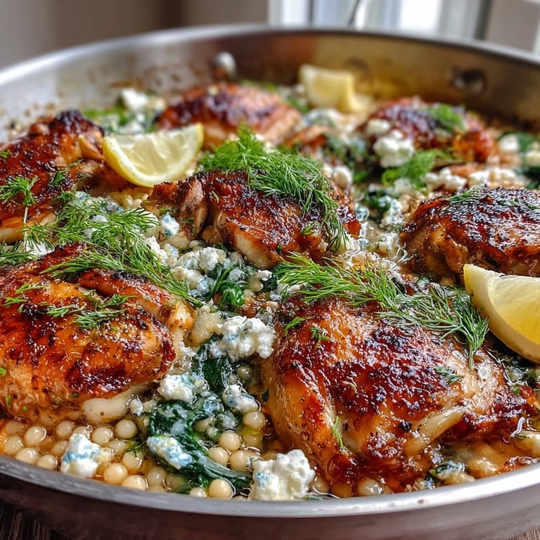 Save There's something about the smell of lemon and oregano hitting a hot skillet that instantly transports me to a sun-drenched kitchen I've never actually been to. My neighbor brought over this creamy Greek chicken and pearl couscous bake one evening, and I watched her work through the steps with such ease that I knew I had to make it myself the next week. The moment those chicken thighs nestled into that creamy couscous bed with feta crumbles scattered on top, I understood why she'd been raving about it. It's the kind of dish that feels fancy enough for guests but simple enough to throw together on a Tuesday night when you're tired of the usual rotation.