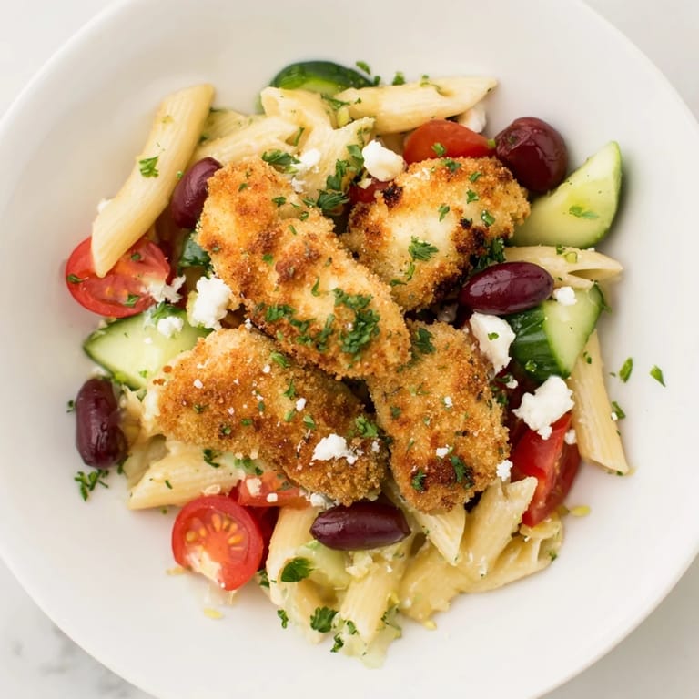 Save The first time I made this crispy chicken Greek pasta, it was actually supposed to be a regular chicken dinner. My cousin from Greece was visiting, and she walked into the kitchen just as I was breading the chicken, looked at the pasta boiling away, and said 'why not put it all together like we do at home.' That completely spontaneous suggestion turned into one of those happy accidents that completely transforms your weeknight dinner rotation. Now whenever I make this, the kitchen fills with this incredible combination of frying chicken and garlicky tomatoes that makes everyone drift in from other rooms asking 'what smells so good.' The way the crispy chicken stays crunchy even after tossing with all those fresh vegetables still feels like magic every single time.