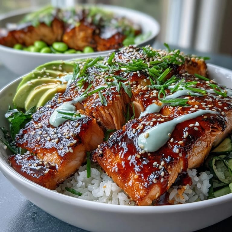 That first time I made this, I was genuinely flying by the seat of my pants, adjusting the honey-to-sriracha ratio by taste until it felt right. What I discovered is that the glaze isn't just a coating—it's the bridge that connects every element on the bowl, adding warmth and depth that plain salmon never could.
