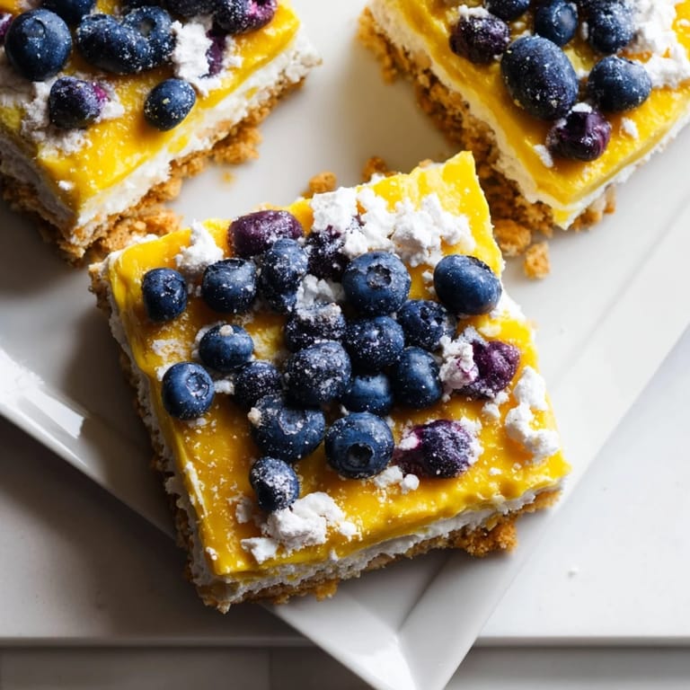 Save I stumbled onto this recipe one rainy spring afternoon when I had too many lemons from a neighbor's tree and a pint of blueberries about to turn. I wasn't planning to bake, but the kitchen smelled like butter and citrus within minutes, and suddenly I had a pan of golden squares that disappeared before dinner. There's something about the contrast—sharp lemon against sweet berries, crumbly crust under silky curd—that makes these feel both elegant and comforting. They've become my go-to whenever I need to bring something that looks impressive but doesn't require fancy skills. Honestly, they taste like sunshine in a square.