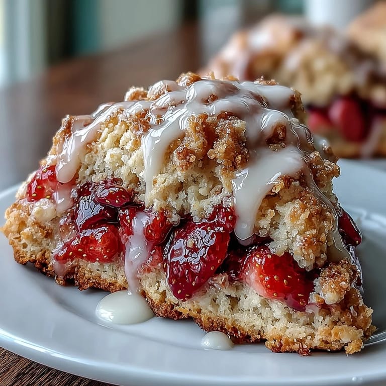 Save What sets these scones apart is the combination of fresh lemon zest in the dough and the bright lemon glaze drizzled on top. The strawberries stay tender and juicy as they bake, creating pockets of fruity sweetness throughout each scone. Cold butter is the secret to achieving that coveted flaky, tender crumb—just like the scones you'd find in a charming English tea room. Serve them warm with extra fresh berries on the side for a breakfast that feels both indulgent and wholesome.