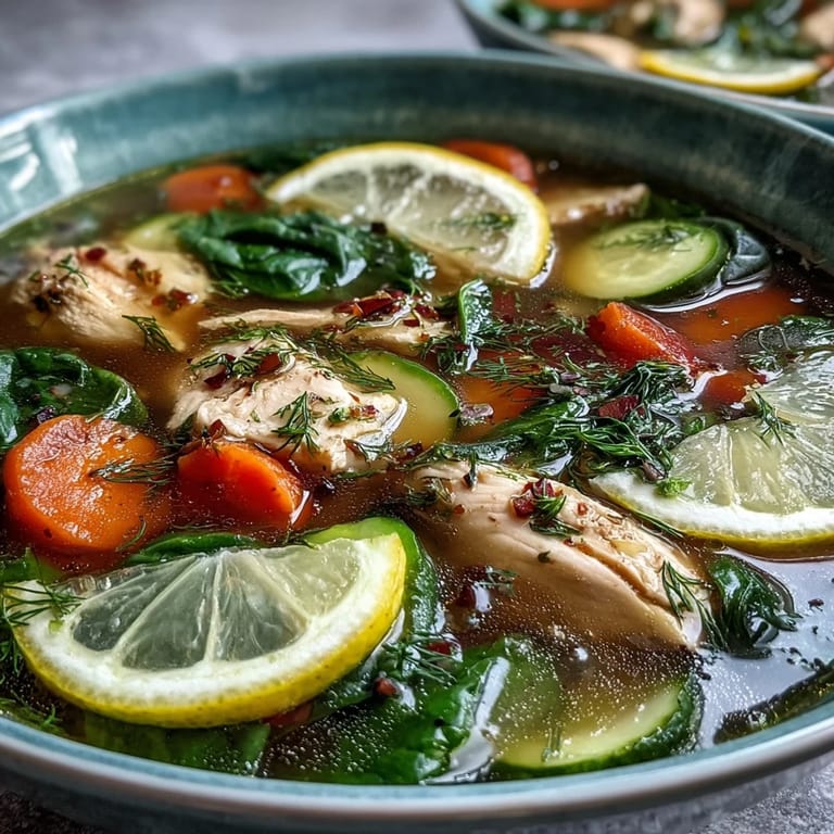 Save There's something about ladling a bowl of clear, golden soup that makes everything feel manageable. I discovered this recipe on a Wednesday morning when my kitchen felt too quiet and my body felt too heavy, like I'd spent weeks eating everything that made me sluggish. The steam rising from that first pot smelled like clarity, like thyme and lemon and the promise of feeling lighter. I've made it dozens of times since, and it never disappoints.