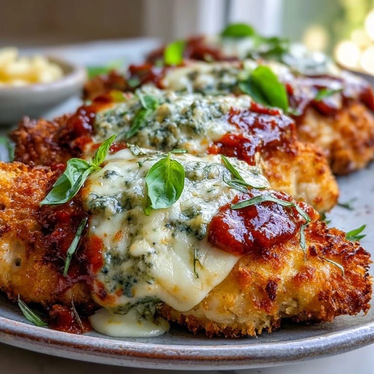 Save My neighbor knocked on the door one Thursday evening with a jar of homemade pesto she'd made from her garden basil. I had chicken breasts defrosted and half a jar of marinara in the fridge, so I decided to layer everything together instead of choosing between pesto pasta and chicken parm. The smell that filled my kitchen that night—garlic, toasted breadcrumbs, melting cheese—made me forget I'd been improvising. It's been my go-to ever since.