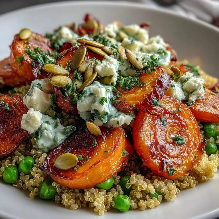 - Divide the fluffy quinoa among bowls, then arrange the roasted carrots, onion, and peas on top like you're building something worth looking at. Drizzle the dressing over everything, then sprinkle with parsley, feta, and pumpkin seeds if you have them.